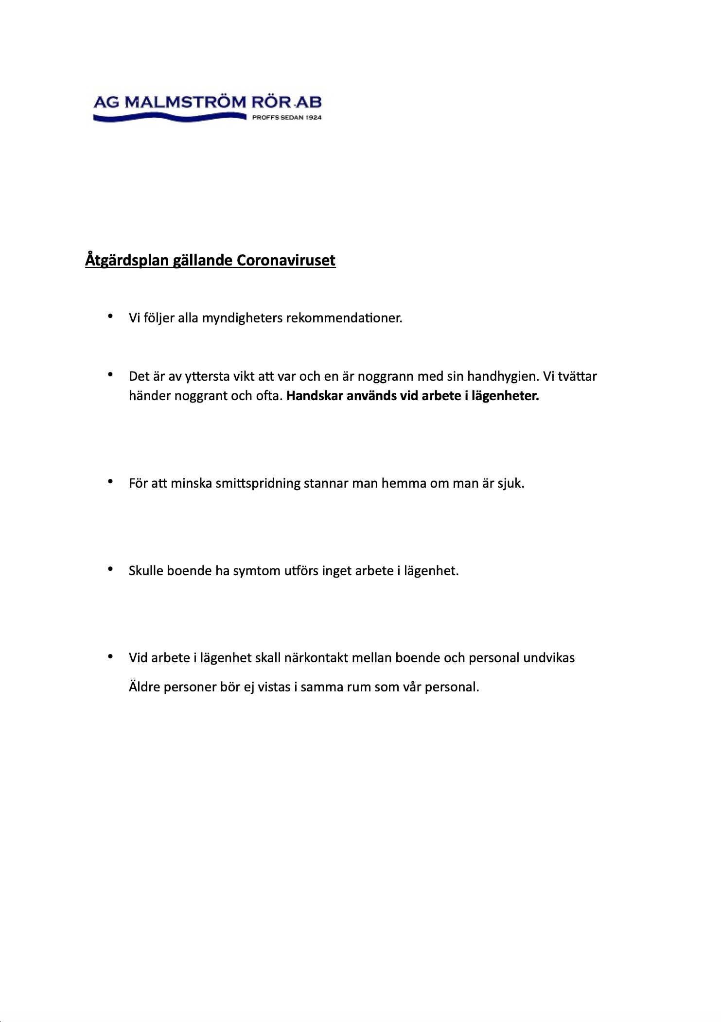 | Tidsplan värmeinjusteringen | Injustering värmesystem infolapp | Åtgärdsplan coronaviruset |