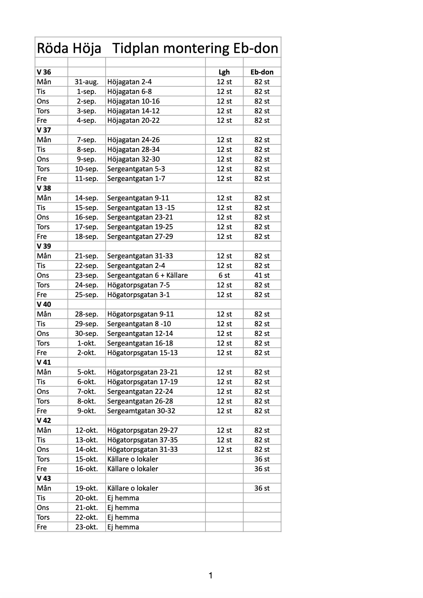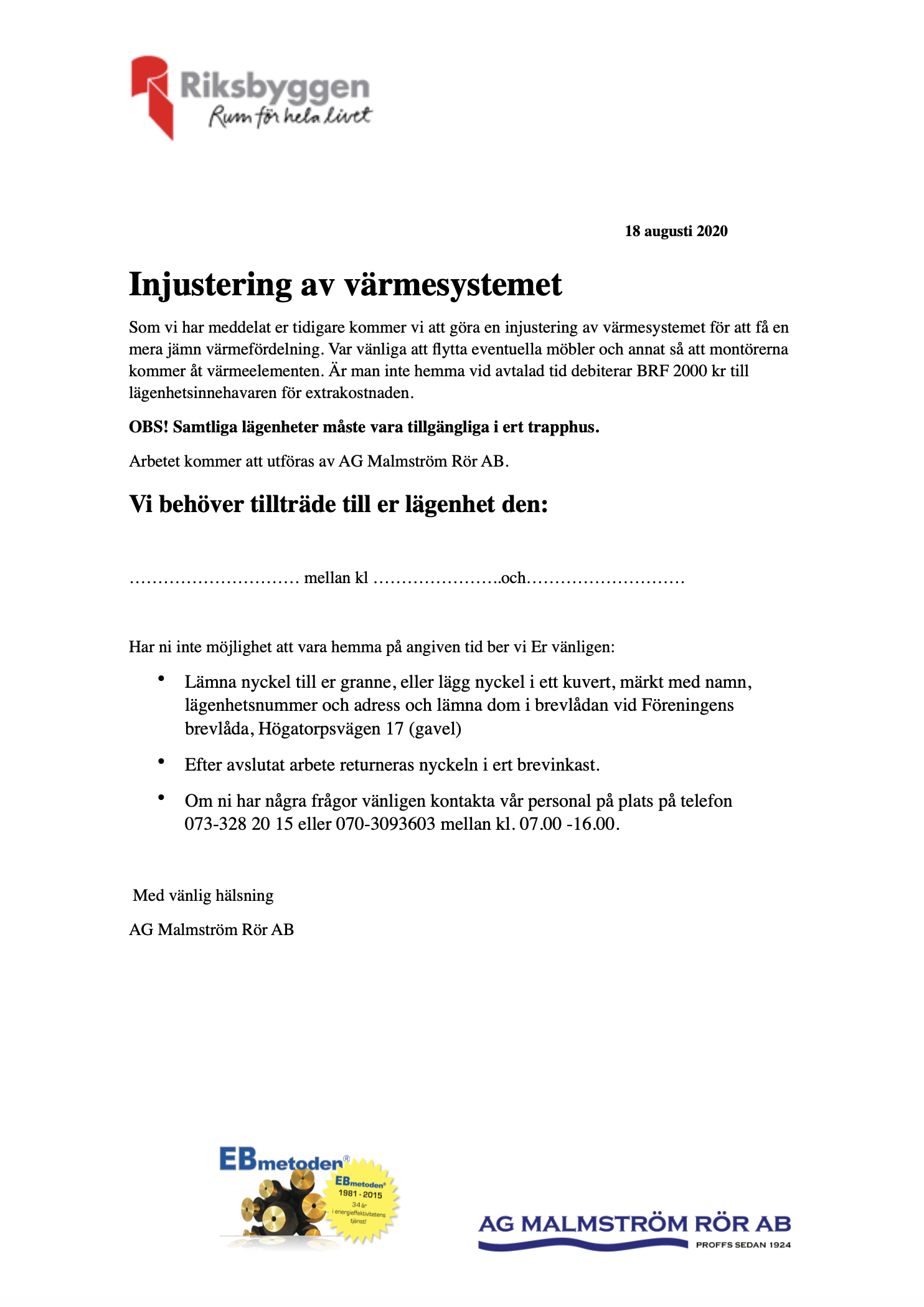 Vecka 36 startar värmeinjusteringen av elementen och arbetet kommer att pågå t o m vecka 47. Ytterligare information inklusive tidsplan finner du genom att klicka på länkarna nedan. Du kommer att få en infolapp med datum och tid 5 dagar före hantverkarna kommer till just din lägenhet.