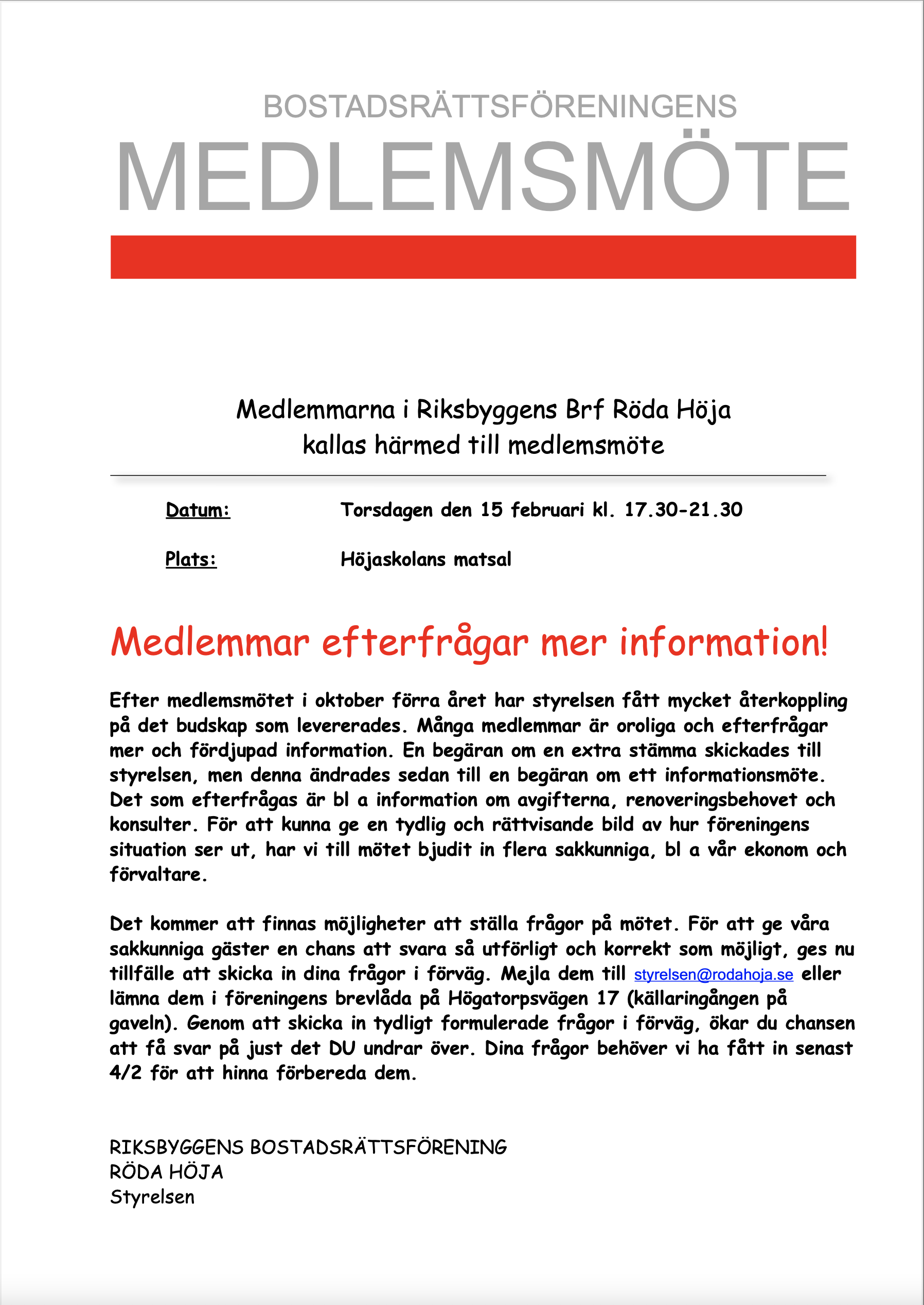Brf Röda Höja kallar till medlemsmöte den 15/2 kl 17:30-21:30 i Höjaskolans matsal. Syftet är att ge uppdaterad och fördjupad information om läget i föreningen. Kallelsen kommer att delas ut i samtliga medlemmars brevlådor de närmaste dagarna, men du kan även läsa kallelsen i sin helhet här. Har du frågor du vill ska besvaras på mötet, så kan du skicka in dem till .